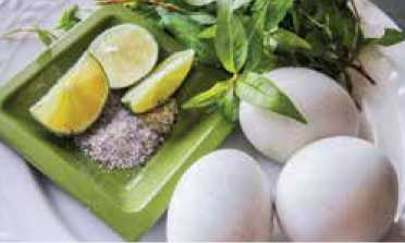 Muối ăn kèm cũng góp phần làm nên vị độc đáo của món này. Muối được xay chung với tiêu rất nhuyễn và mịn. Trộn với ớt xay, vắt chút chanh, quậy thật đều, bỏ quả trứng vô cái chung nhỏ, gõ đầu, bóc chút vỏ rồi húp ngụp nước ngọt ngọt, ấm ấm. Thêm chút muối cho vào trứng rồi xắn một miếng, kèm vài lá rau răm cay cay. Đơn giản vậy thôi mà không trùng hương vị với bất cứ nơi nào. Ăn là nhớ và muốn quay trở lại